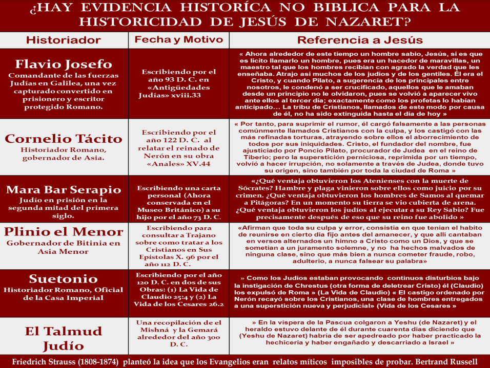 Lamentablemente perdí aquel escrito que escribí hace 20 años y estoy en el proceso de realizarlo de nuevo. Por ahora, ofrezco una gráfica que contiene los datos que incluían aquel primer estudio. Durante los siglo XVIII y siguientes en toda Europa, particularmente en Alemania, surgieron una corriente de filósofos y modernistas Alemanes que comenzaron a divulgar la falsa premisa que no teníamos en la historia fuera de los evangelios registros serios para confirmar la “historicidad” de Jesús de Nazaret. Que Todo se reducía a la mentalidad ilusionaria de una pequeña banda de discípulos que cansados de la servidumbre Romana a la que estaban expuestos y que “inventaron” un “Mesías” protagónico de enseñanzas que podrían curar sus ilusiones cargadas de esperanzas.