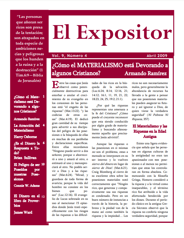 Les comparto otra edición especial de nuestra publicación de apenas hace pocos años. Fue enviada a sus correos electrónicos en Abril de 2009. Estoy revisando la gramática de todo el material (12 páginas) y subiendo al blog esta edición esperando que sea de utilidad para muchos Cristianos que ahora nos siguen a través de este medio. Los artículos son: (1) ¿Cómo El Materialismo está Devorando a Algunos Cristianos? Por su servidor. (Podrían encontrar la serie completa de 3 partes en la sección de “Estudios Temáticos”) (2) La Atracción del Materialismo por Harry Osborne, (3) ¿Es el Dinero la Respuesta a Todo? Por Brian Sullivan (Este magnífico material que el hno. Sullivan expuso en las Lecturas del Colegio Florida en Febrero de 1992 está también completo en el blog), (4) El Peligro de Ser Poseídos por Nuestras Posesiones por Connie W. Adams, y (5) El Dinero en el Libro de Proverbios por James Ward.