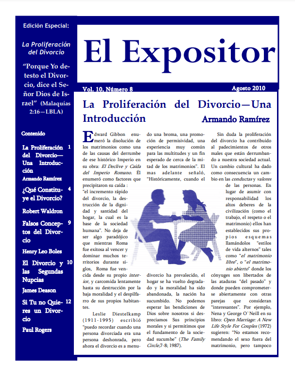 En la edición de Agosto de 2010 editamos esta colección de necesitados artículos para estudiar “La Proliferación del Divorcio” en una generación que va en aumento ya no sólo en los matrimonios entre incrédulos sino igualmente entre aquellos que reclaman ser hogares “Cristianos”.