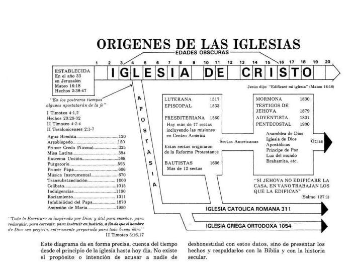 Esta gráfica (de la cual no soy el autor) “La Iglesia de Cristo y El Origen de las Denominaciones” ha sido muy popular y generalmente ha sido usada por muchos autores Cristianos que han escrito tratados, escritos o libros para relatar la historia de la Iglesia y el Origen del Sectarismo hecho por los hombres.