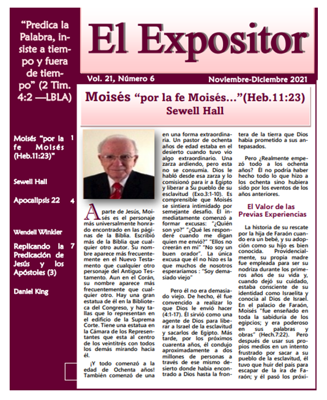 (1) Por la Fe Moisés, comprende el capitulo 4 del libro: The Winter of the Life escrito por el hermano Sewell Hall en Diciembre de 2019. Después de conseguir el amable permiso editorial del hermano Gardner, (su hijo) estamos muy contentos en publicar esta parte del libro de su padre. El hermano Sewell repasa las vidas de 12 conocidos personajes de la Biblia y resalta como ellos sirvieron a Dios en y a pesar de su vidas mayores. En el análisis de Moisés, el autor observa como los preparativos para más grandes desafíos estuvieron presentes en la primera mitad del antiguo profeta y libertador de Israel. Con aplicaciones de discípulos de la época reciente, el hermano Sewell hace un llamado a la preparación en el relevo de cada siervo del Señor, ya sea un anciano, diacono o evangelista.