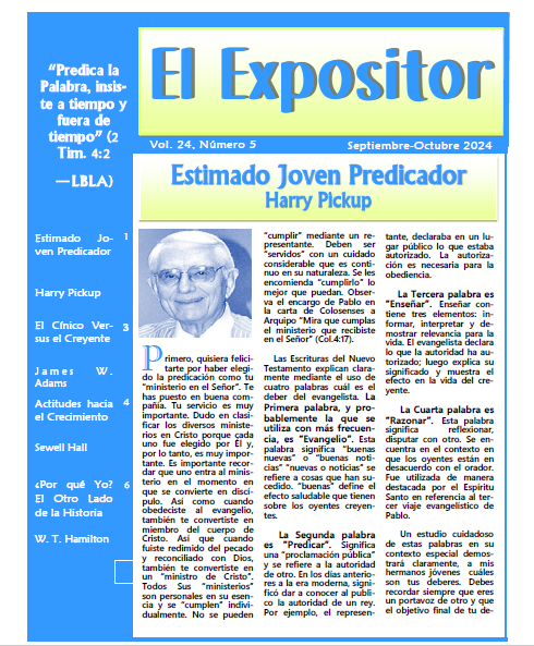(1) Estimado Joven Predicador por Harry Pickup es la carta dirijida a jovenes predicadores escrita desde la experiencia, buena voluntad y deseo de contribuir con nuevas generaciones de predicadores de parte del autor, un obrero exprimentado quien predicó por muchas decadas (1924-2016). Un amigo suyo (Ken Weliever) se refirió a él en el día de su fallecimiento (27 de enero de 2016) con un consejo que él recibió del hermano Pickup: “El advirtió que los predicadores jovenes son suceptibles a dos extremos: (1) A Aceptar todo los que los predicadores mayores creen sin estudiarlo por si mismos; y (2) Rechazar todo lo que los predicadores enseñan sin estudiarlo por si mismos. El nos exhortó a comprometernos con el estudio, desarrollar una fe personal, y saber lo que creemos y porque lo creemos”